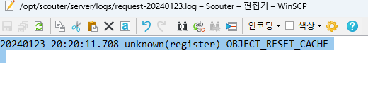 서버 상의 로그를 확인해보니 이런 식으로 'unknown(register) OBJECT_RESET_CACHE' 만 요청이 오는 것을 확인했다.