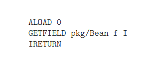 이 명령어를 통해 스택의 상단에 있는 객체(this, 여기서는 Bean 인스턴스)로부터 f 필드의 값을 가져와서 다시 스택의 상단에 푸시