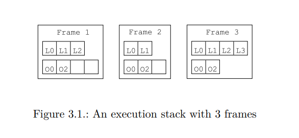 두 번째 명령은 로컬 변수 1을 푸시하는데, 이 변수는 이 메소드 호출을 위한 프레임 생성 시 f 인수 값으로 초기화되었다. 세 번째 명령은 이 두 값을 팝하고, 참조된 객체의 f 필드에 int 값을 저장한다, 즉 this.f에 저장한다. 마지막 명령은 소스 코드에서는 암시적이지만 컴파일된 코드에서는 필수적으로, 현재 실행 프레임을 파괴하고 호출자에게 반환한다. 이 메소드에 대한 실행 프레임의 연속적인 상태는 그림 3.3에서 보여진다.