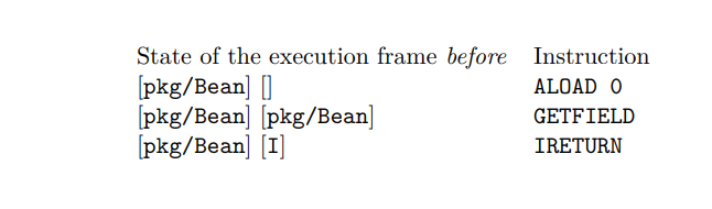 예를 들어, 이전 섹션에서 getF 메소드를 고려한다면, ALOAD 전, GETFIELD 전, IRETURN 전에 실행 프레임의 상태를 제공하는 세 개의 스택 맵 프레임을 정의할 수 있다. 이 세 개의 스택 맵 프레임은 그림 3.2에서 보여진 세 가지 경우에 해당하며, 다음과 같이 설명될 수 있다. 여기서 첫 번째 대괄호 사이의 타입은 로컬 변수에 해당하고, 다른 타입은 operand 스택에 해당한다: