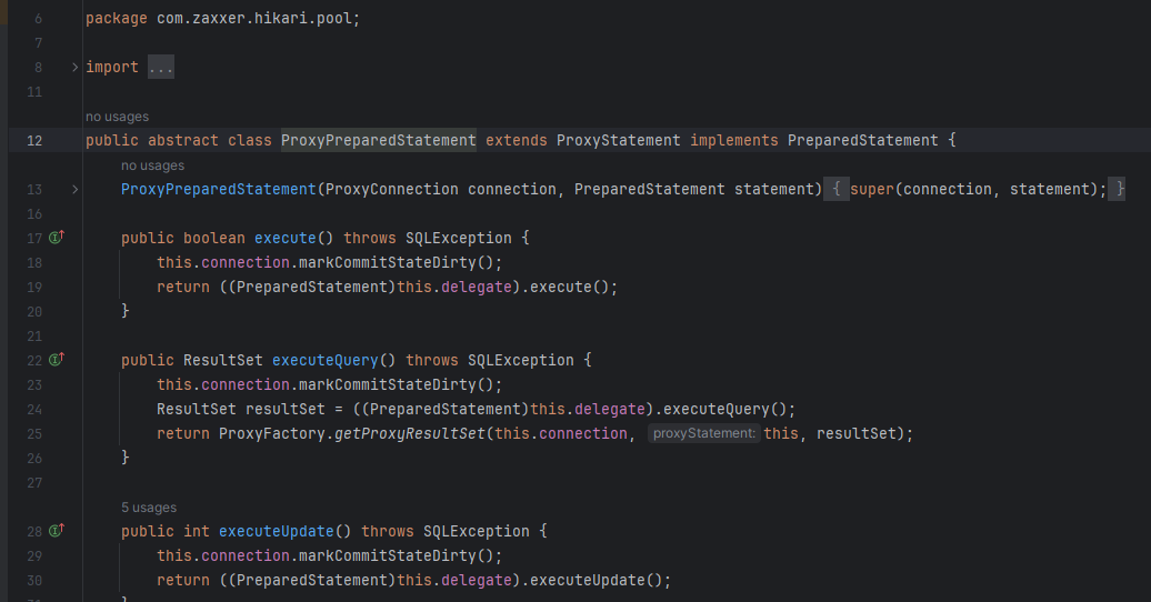 그렇기에 executeUpdate가 호출되면, 먼저 HikariProxyPreparedStatement의 오버라이드된 메서드가 호출되고, 이 메서드 내부에서 super.executeUpdate() 형식으로 부모 클래스인 ProxyPreparedStatement의 executeUpdate 메서드를 명시적으로 호출된다.