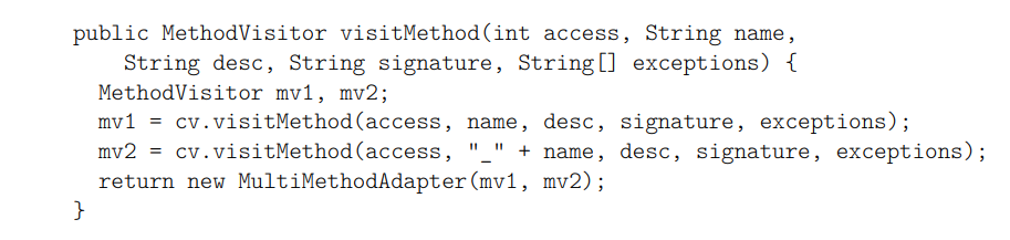 @Override public MethodVisitor visitMethod(int access, String name,
