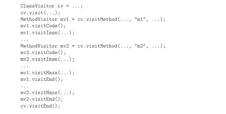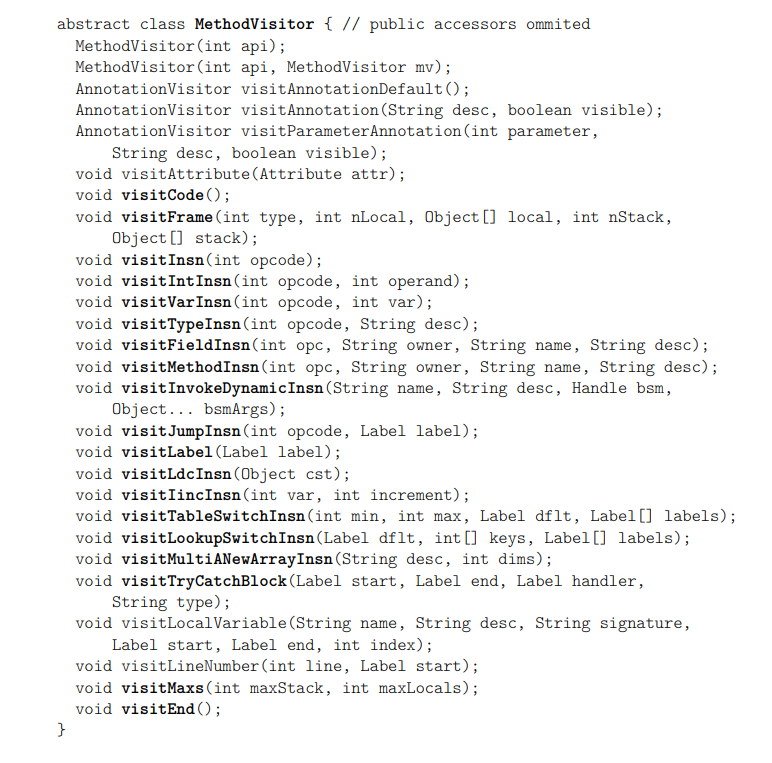 이제 ClassVisitor 및 MethodVisitor 하위 클래스에서 모든 요소를 함께 놓을 수 있다.