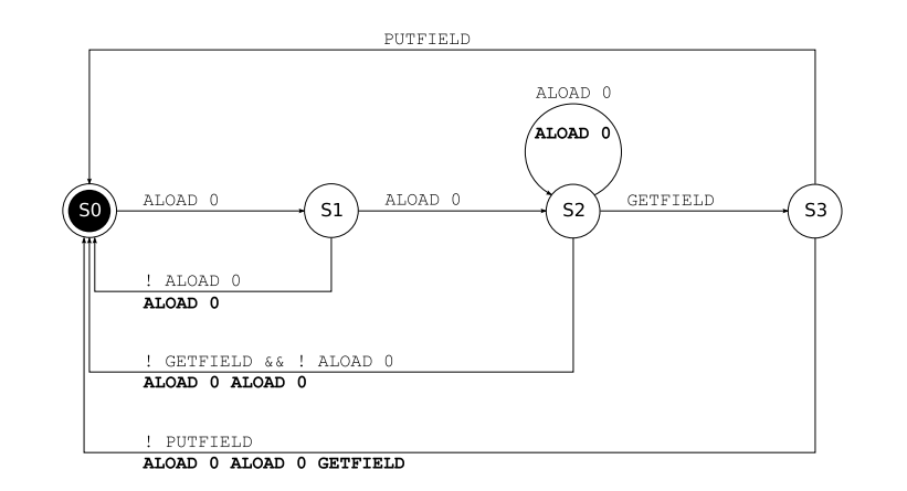 이전 예제는 더 복잡한 지시문 시퀀스로 쉽게 일반화될 수 있다. 예를 들어, f = f; 또는 바이트코드에서 ALOAD 0 ALOAD 0 GETFIELD f PUTFIELD f와 같은 자기 필드 할당을 제거하는 변환을 고려해 보자. 이 변환을 구현하기 전에, 이 시퀀스를 인식하는 상태 기계를 설계하는 것이 바람직하다(그림 3.6 참조).