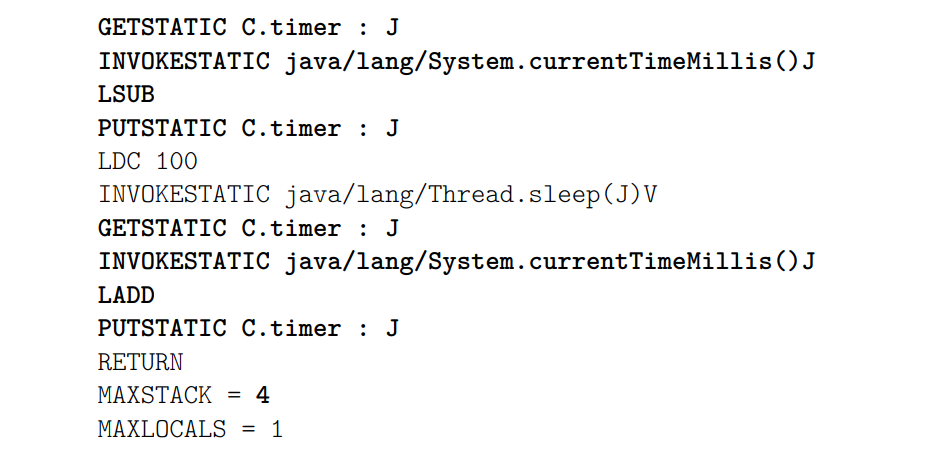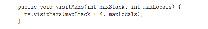 추가한 지시문은 두 개의 long 값을 푸시하므로 operand stack에 네 개의 슬롯이 필요하다. 메서드의 시작에서 operand stack은 처음에 비어 있으므로, 시작 부분에 추가된 네 가지 지시문은 크기가 4인 스택을 필요로 한다는 것을 알 수 있다. 또한 삽입된 코드는 푸시한 만큼의 값을 팝하기 때문에 스택 상태를 변경하지 않는다(팝하는 값만큼 푸시하기 때문). 결과적으로, 원래 코드가 크기 s의 스택을 필요로 하는 경우, 변환된 메서드에 필요한 최대 스택 크기는 max(4, s)이다. 안타깝게도 return 지시문 앞에 네 가지 지시문을 추가하며, 여기서는 이 지시문들 바로 앞의 operand stack 크기를 알 수 없다. 그저 이것이 s 이하임을 알 뿐이다. 결과적으로, return 지시문 앞에 추가된 코드는 최대 s + 4 크기의 operand stack을 필요로 할 수 있다고 말할 수 있다. 이 최악의 시나리오는 실제로는 드물게 발생한다: 일반적인 컴파일러에서 RETURN 전의 operand stack은 반환 값만 포함하므로, 크기가 최대 0, 1, 또는 2이다. 그러나 모든 가능한 경우를 처리하려면 최악의 시나리오를 사용해야 한다(다행히도 최적의 operand stack 크기를 제공할 필요는 없다. 이 최적 값보다 크거나 같은 값을 제공하는 것이 가능하긴 하지만, 이는 스레드의 실행 스택에 메모리를 낭비할 수 있다). 그러면 visitMaxs 메서드를 다음과 같이 오버라이드해야 한다.
