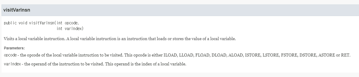 ( visitVarInsn은 지역 변수를 조작하는 지시문을 다루고, visitInsn은 기본적인 연산을 수행하는 지시문에 가깝다.)