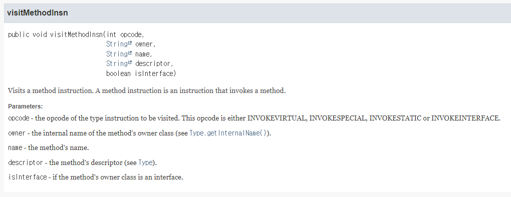 - INVOKEINTERFACE : 인터페이스 메서드 호출 시 사용 : "interfaceInstance.interfaceMethod()" - owner(String): 호출되는 메서드가 속한 클래스 또는 인터페이스의 내부 이름(internal name), ex : "java/lang/String"