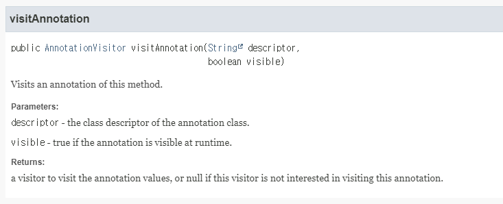 return : AnnotationVisitor 객체를 반환한다. 이것을 사용하여 어노테이션 처리를 진행한다.