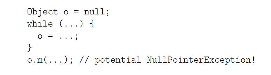 가정해 보자. 잠재적으로 null인 객체에 대한 필드 접근이나 메소드 호출을 감지하고 싶다. 예를 들어, 다음 소스 코드 조각에서 첫 번째 줄은 일부 컴파일러가 버그를 감지하지 못하게 하여, 그렇지 않으면 "o가 초기화되지 않았을 수 있음" 오류로 감지될 것이다: