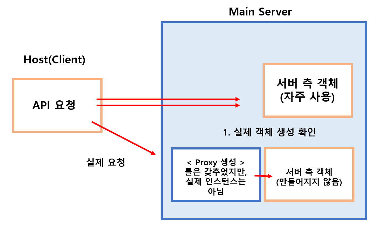 4-1. 클라이언트가 프록시 객체를 통해 특정 연산을 요청할 때, 프록시 객체는 내부적으로 실제 객체가 이미 생성되었는지를 확인한다.