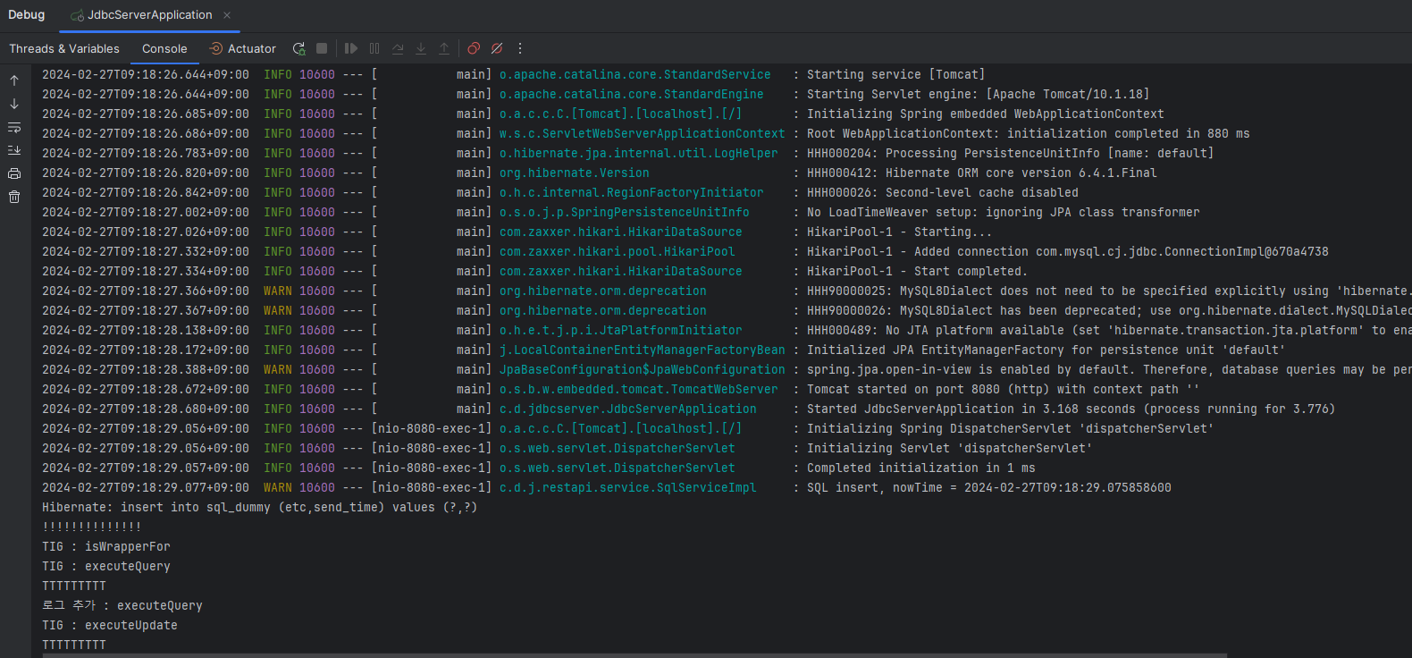 2024-02-27T09:18:29.077+09:00 WARN 10600 --- [nio-8080-exec-1] c.d.j.restapi.service.SqlServiceImpl : SQL insert, nowTime = 2024-02-27T09:18:29.075858600