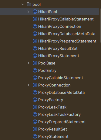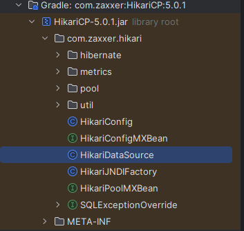 HikariCP의 핵심 패키지로, 커넥션 풀 관리, 설정, 커넥션의 생성 및 반환 등을 담당하는 클래스들이 위치한다. HikariDataSource 클래스가 이 패키지에 속해 있으며, 애플리케이션에서 직접 사용되는 주요 진입점이다.