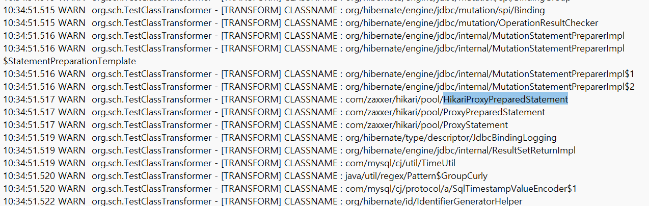 이를 좀더 자세히 알아보고자 로깅을 추가하여 분석하였다. ClassFileTransformer 구현체가 클래스를 읽으면, 이름을 출력하게 하였다.