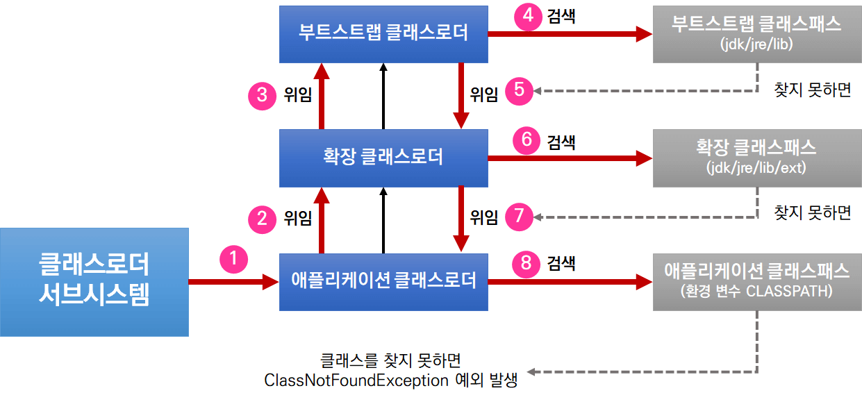 이 과정에서 자식 클래스 로더는 부모 클래스 로더가 로드한 클래스를 볼 수 있지만, 부모 클래스 로더는 자식 클래스 로더가 로드한 클래스를 직접 볼 수 없다.