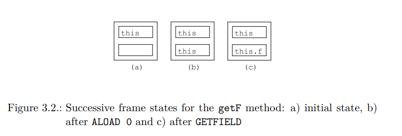 두 번째 명령은 로컬 변수 1을 푸시하는데, 이 변수는 이 메소드 호출을 위한 프레임 생성 시 f 인수 값으로 초기화되었다. 세 번째 명령은 이 두 값을 팝하고, 참조된 객체의 f 필드에 int 값을 저장한다, 즉 this.f에 저장한다. 마지막 명령은 소스 코드에서는 암시적이지만 컴파일된 코드에서는 필수적으로, 현재 실행 프레임을 파괴하고 호출자에게 반환한다. 이 메소드에 대한 실행 프레임의 연속적인 상태는 그림 3.3에서 보여진다.