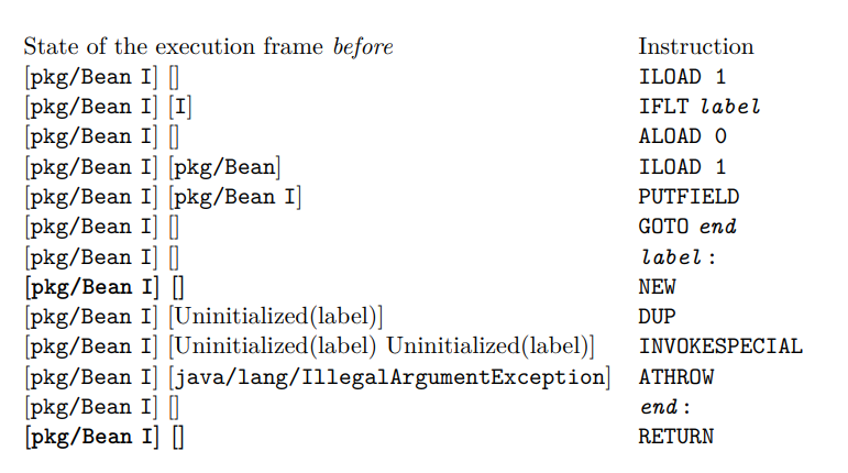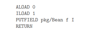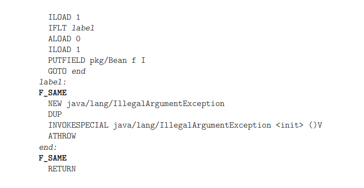 다음 세 명령은 setF 메소드의 명령과 동일하다. GOTO 명령은 무조건적으로 end 레이블로 지정된 명령, 즉 RETURN 명령으로 점프한다. label과 end 레이블 사이의 명령은 예외 객체를 생성하고 operand 스택에 푸시한다: NEW 명령은 예외 객체를 생성하고, DUP 명령은 스택에서 이 값을 복제한다. INVOKESPECIAL 명령은 이 두 복사본 중 하나를 팝하고 그것에 예외 생성자를 호출한다. 마지막으로 ATHROW 명령은 남은 복사본을 팝하고 예외로 던진다(그래서 실행은 다음 명령으로 계속되지 않는다).