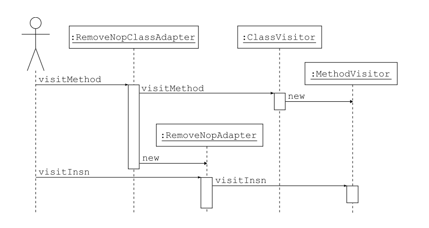 RemoveNopAdapter와 RemoveNopClassAdapter 예제는 메서드 방문자(MethodVisitor)에서 특정 메서드를 대상으로 그 메서드에만 적용되는 특수한 로직을 구현하기 위해 어댑터를 사용하는 방법을 보여준다.