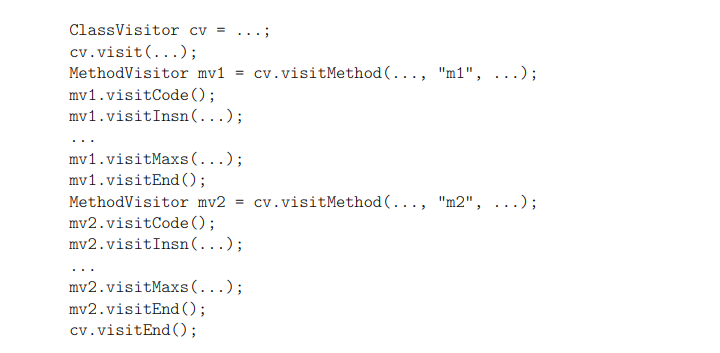 이제 ClassVisitor 및 MethodVisitor 하위 클래스에서 모든 요소를 함께 놓을 수 있다.