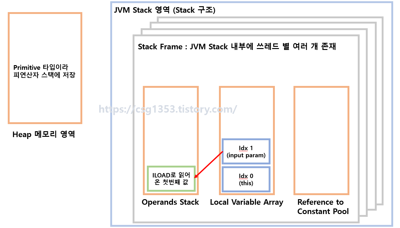 2. 이후 ILOAD를 통해 지역 배열에서 1번째 인덱스, Int형 변수를 가져온다. 이는 일반적으로 첫 번째 입력 파라미터( 메서드의 첫 번째 매개변수)를 의미한다. 이 값을 스택 메모리에 넣는다.