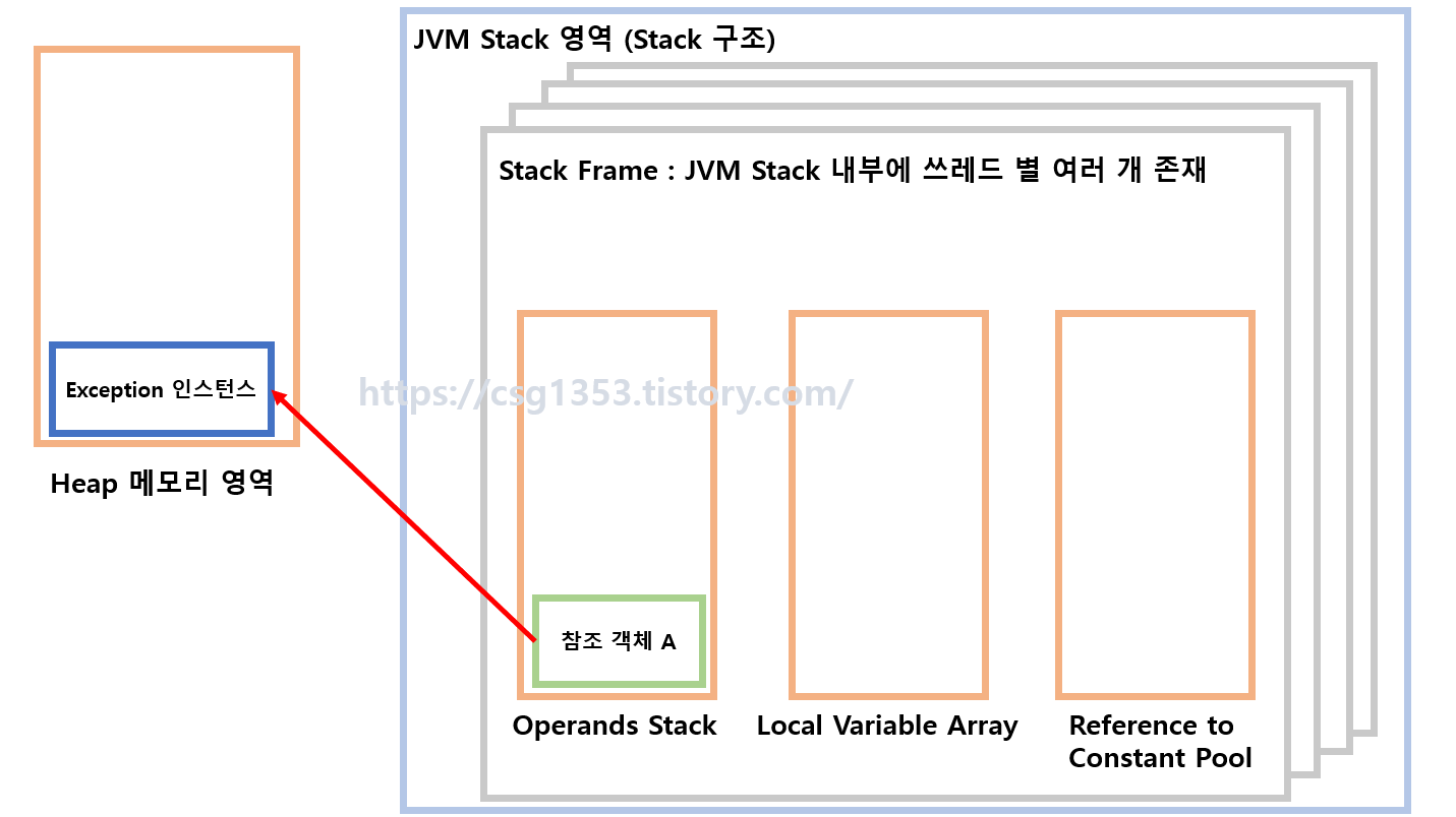 이 상태로 피연산자 스택이 유지된다면, Heap 메모리에서 만들어진 Exception 인스턴스는 GC에 의해서 정리될 것이다. (연관 참조가 없기 때문)