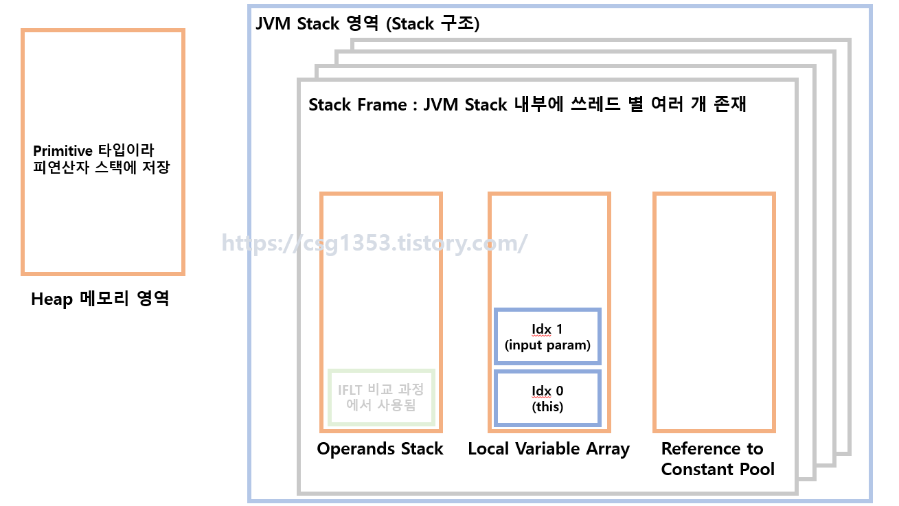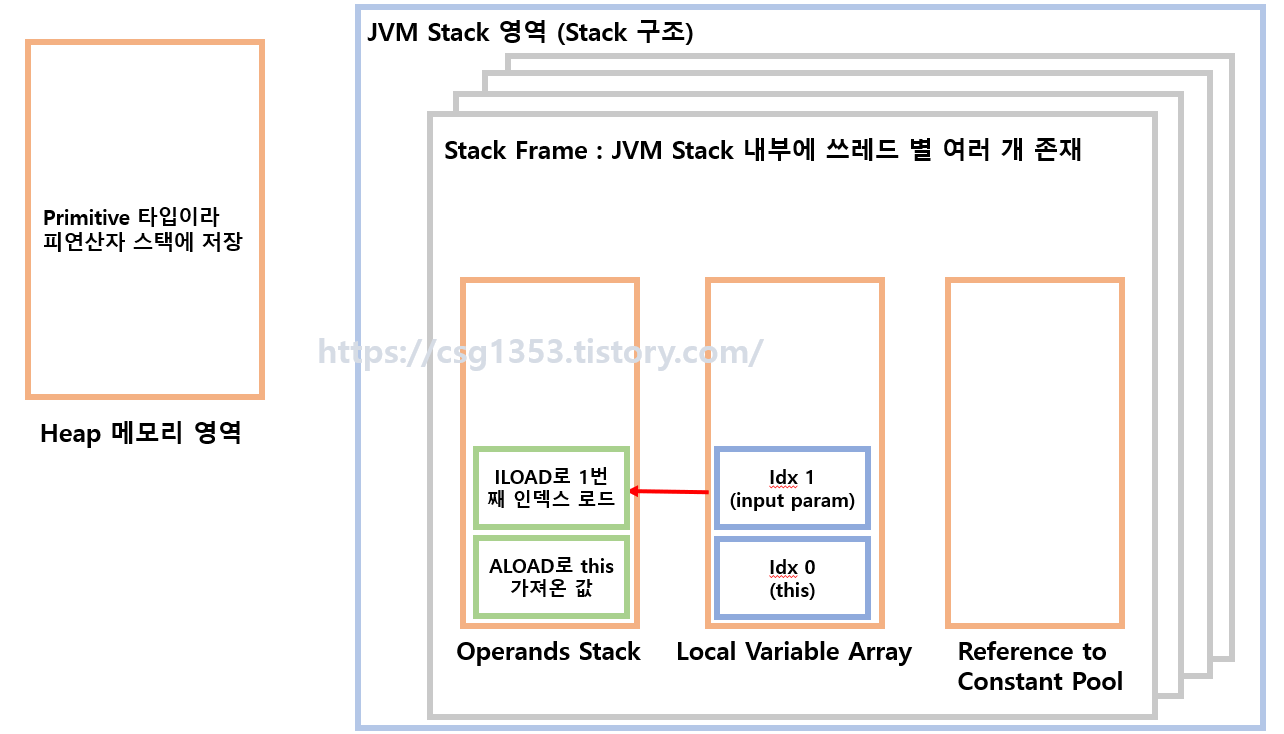 1. 먼저 지역 변수 배열에서 0번째 인덱스를 스택 메모리에 저장한다. (ALOAD) 이는 객체형이며, 일반적으로 0번째는 자기 자신(this)의 인스턴스이다.