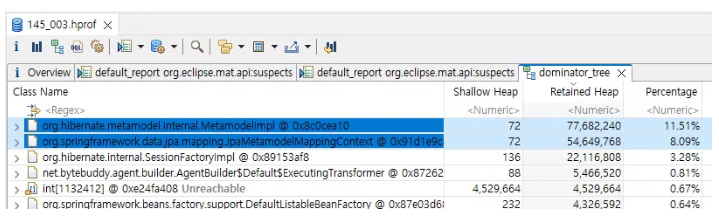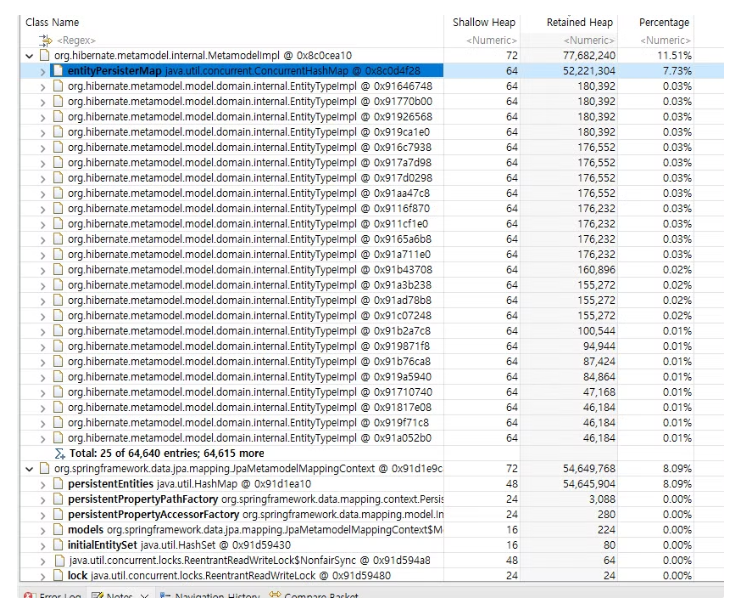 이 두 객체는 각각 entityPersisterMap과 persistentEntities 맵을 포함하고 있으며, 이 맵들이 대부분의 메모리를 사용하고 있다.
