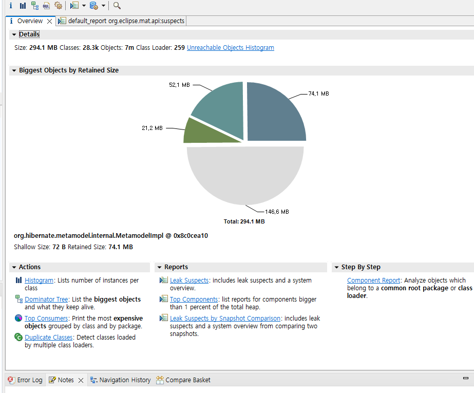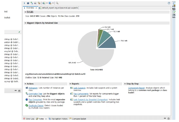 - 이 보고서는 메모리 누수가 의심되는 객체들을 자동으로 탐지하고, 누수가 발생할 가능성이 높은 경로를 보여준다.