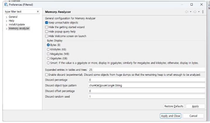 - Preferences 창에서 Memory Analyzer 섹션으로 이동한다.