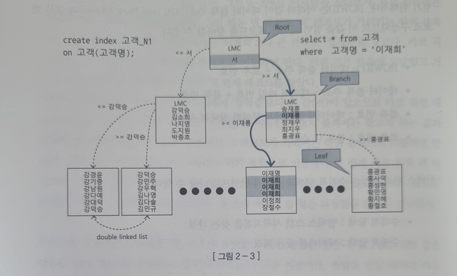 본 그림의 예시 일부를 보면, '이재룡' 의 블록의 하위 리프에는 '이재룡' 보다 크거나 같은(varchar) 노드가 하위에 있음을 확인할 수 있다. 이것은 일반적인 설명이지만, 해당 사진에서 확인해야 할 부분이 있다.