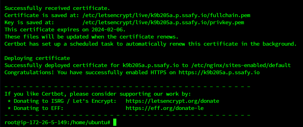- ssl_certificate와 ssl_certificate_key 지시어는 각각 Let's Encrypt에서 발급받은 인증서와 개인 키 파일의 경로를 지정한다.